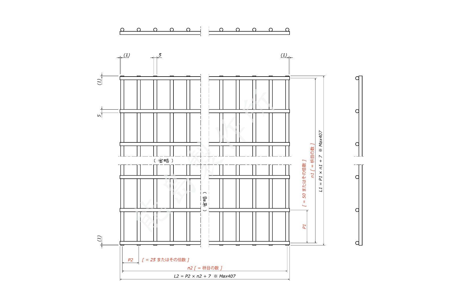• 本品番で必須なのは P1, P2, n1, n2 の寸法です。L1, L2 がそれぞれ 407mm 以内になるように指定してください。