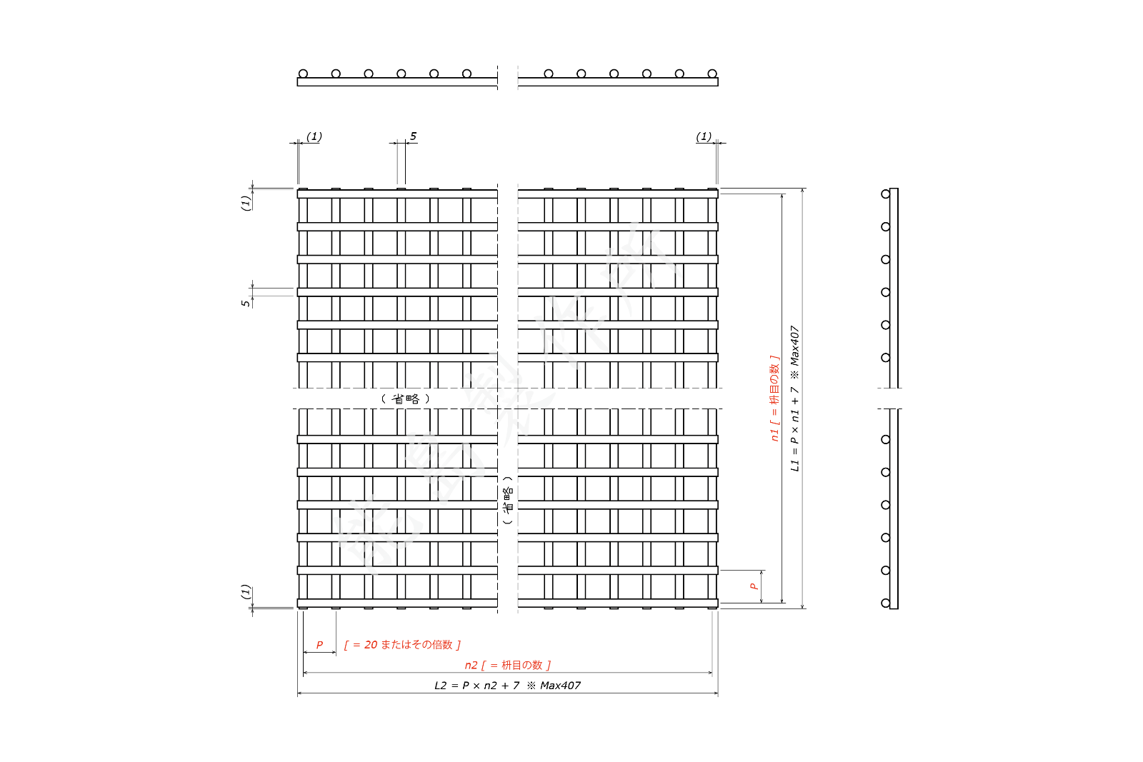 • 本品番で必須なのは P, n1, n2 の寸法です。L1, L2 がそれぞれ 407mm 以内になるように指定してください。