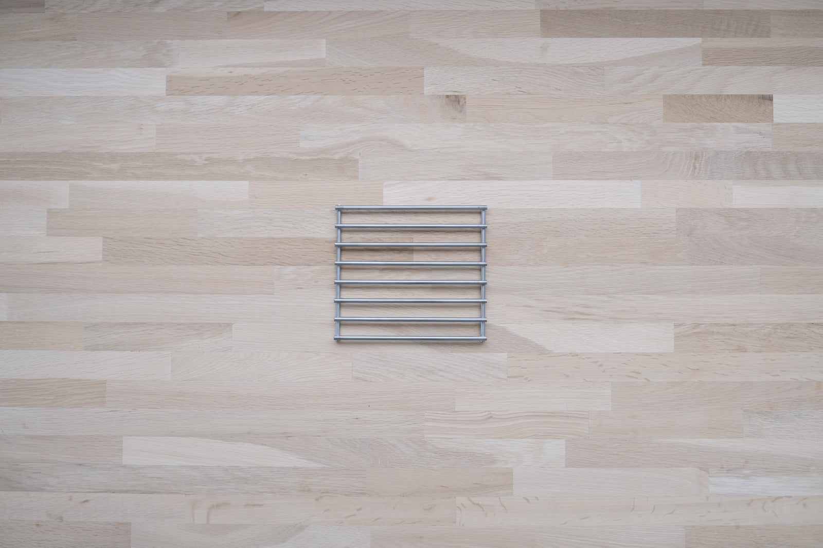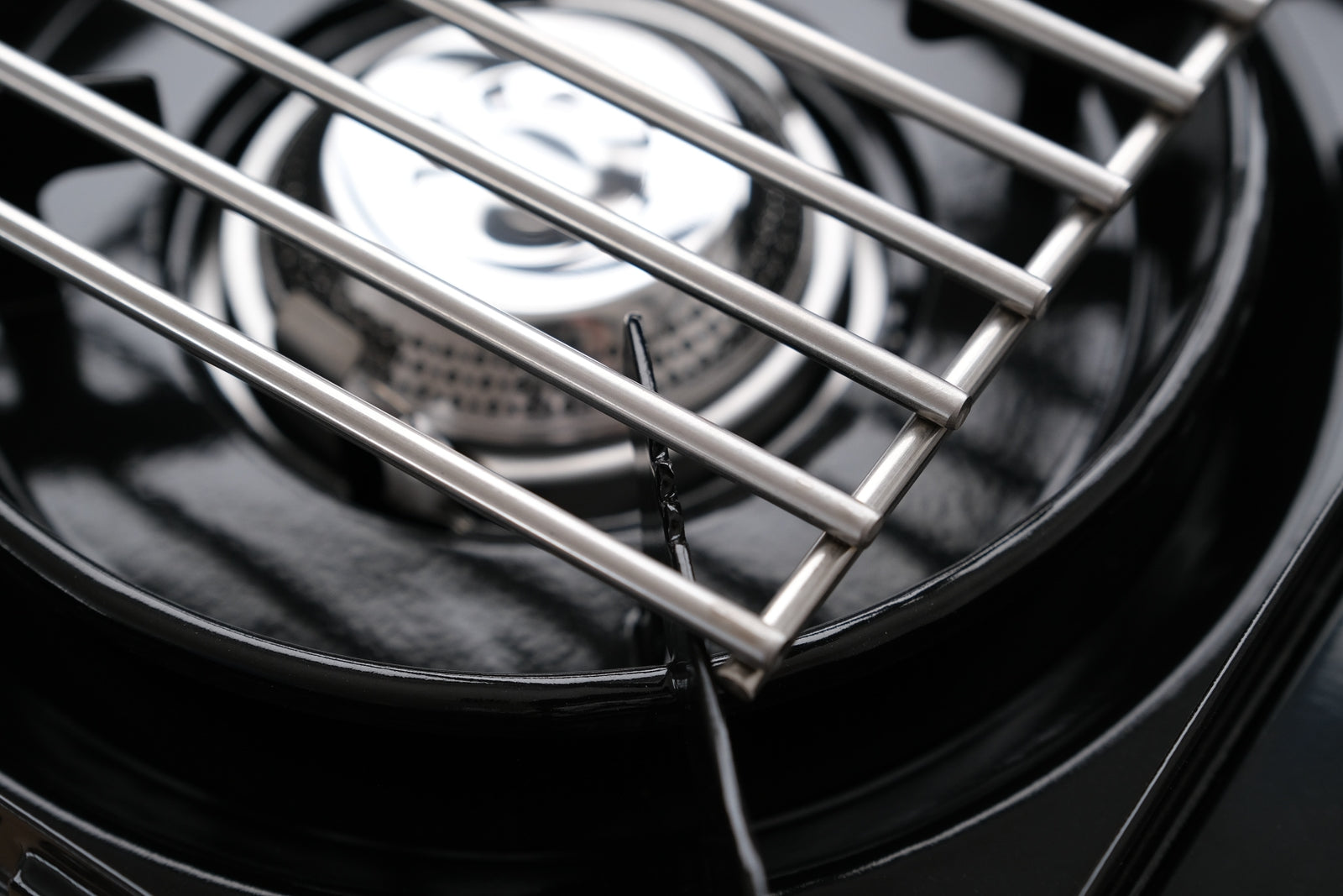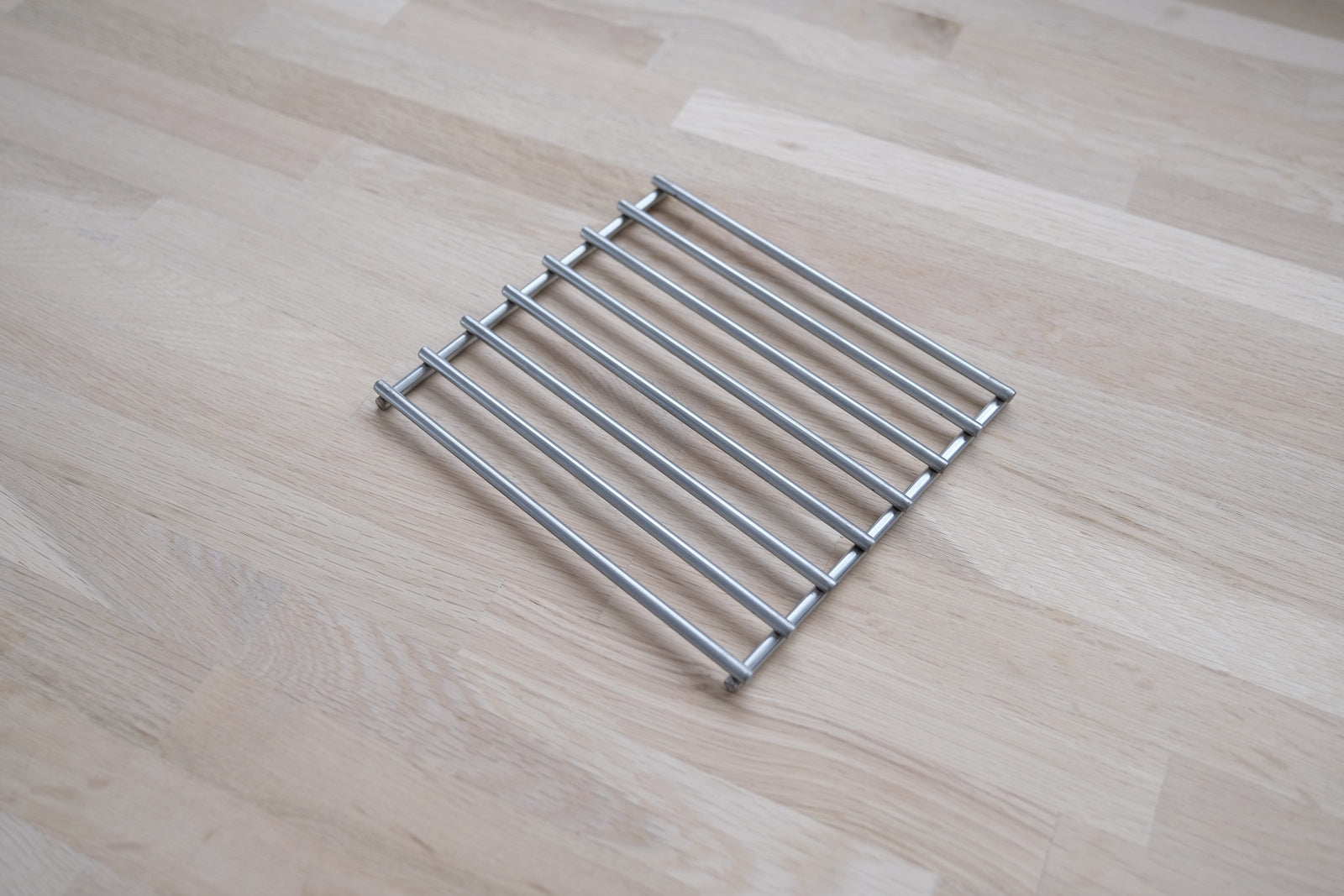 焜炉用の五徳です。線径は 5mm 、材料は日本製のステンレス鋼で、SUS304W1 より硬めの SUS304W2 を使用しています。焜炉側の五徳4本がそれぞれ直角(=90°)であれば大方汎用できます。ご購入前に本製品を設置する焜炉の寸法を必ずご確認ください。製品の寸法交差は ±1mm です。