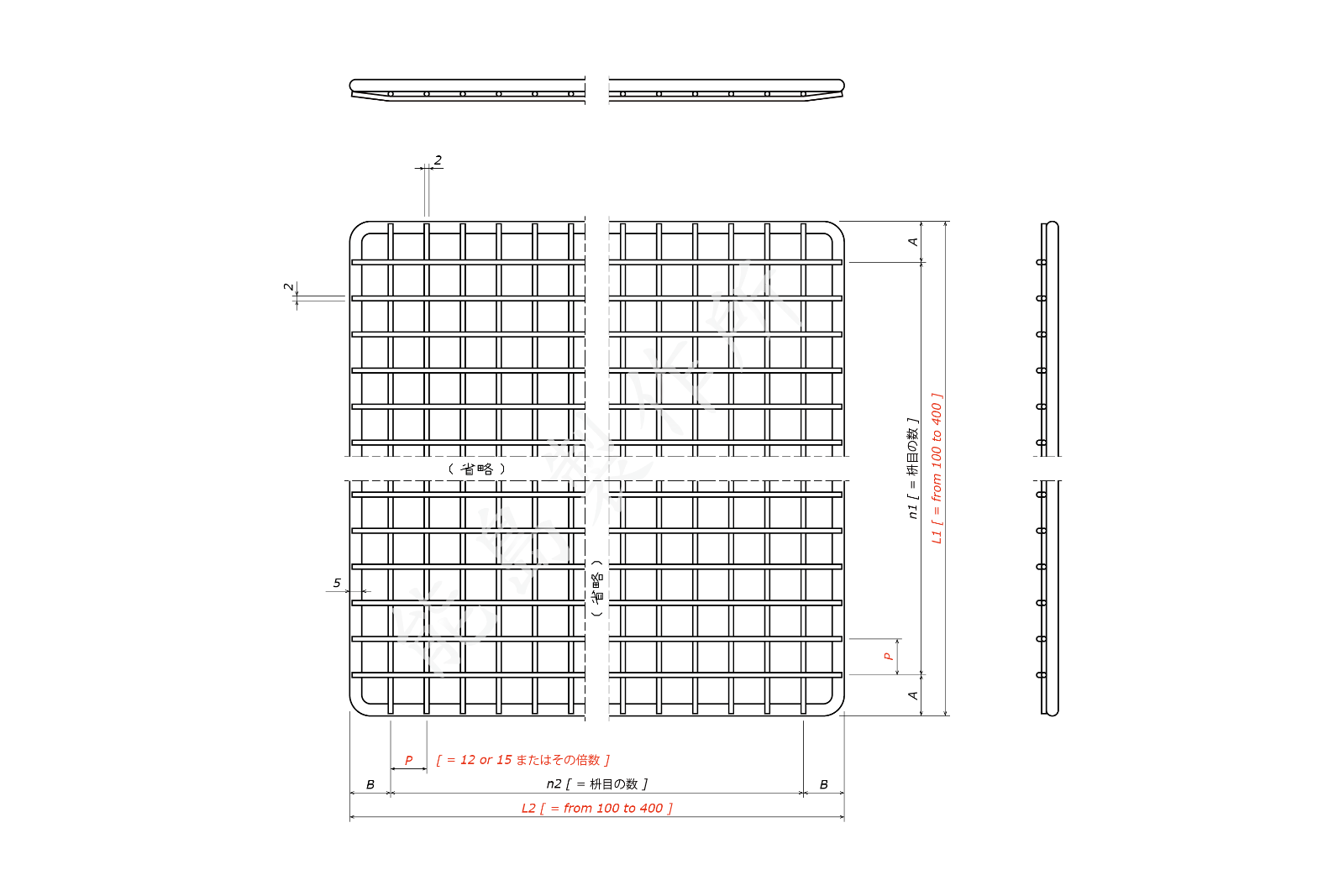 • 本品番で必須なのは P, L1, L2 の寸法です。A, B は未記入であればこちらで割り振ります。