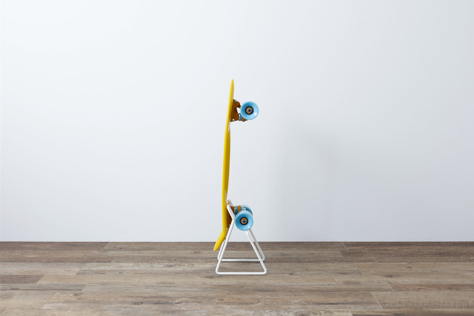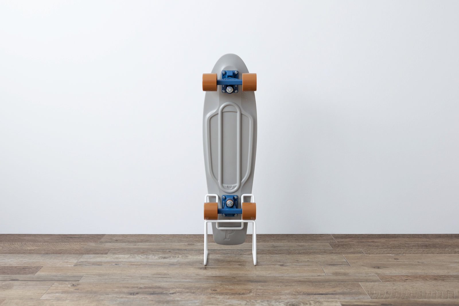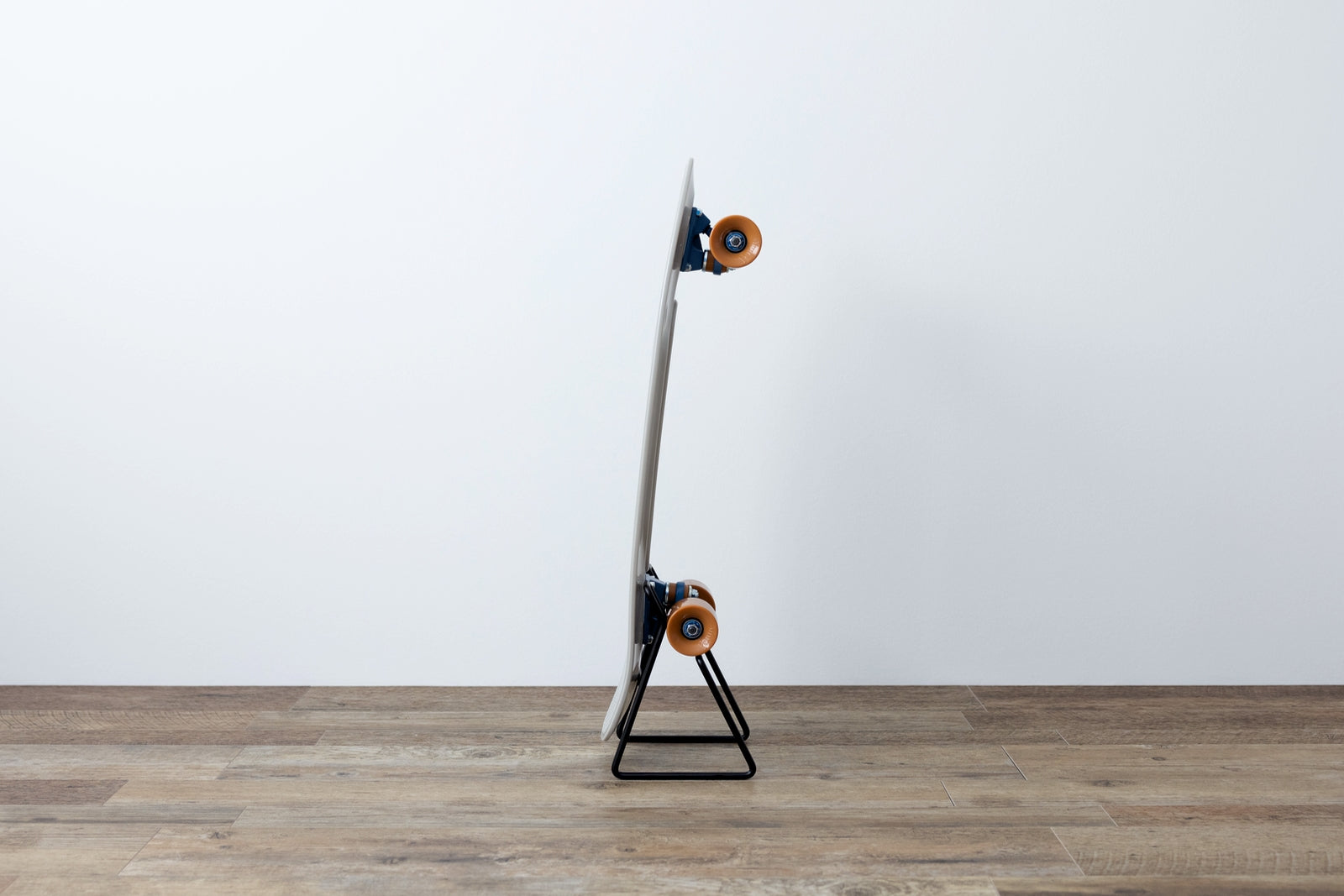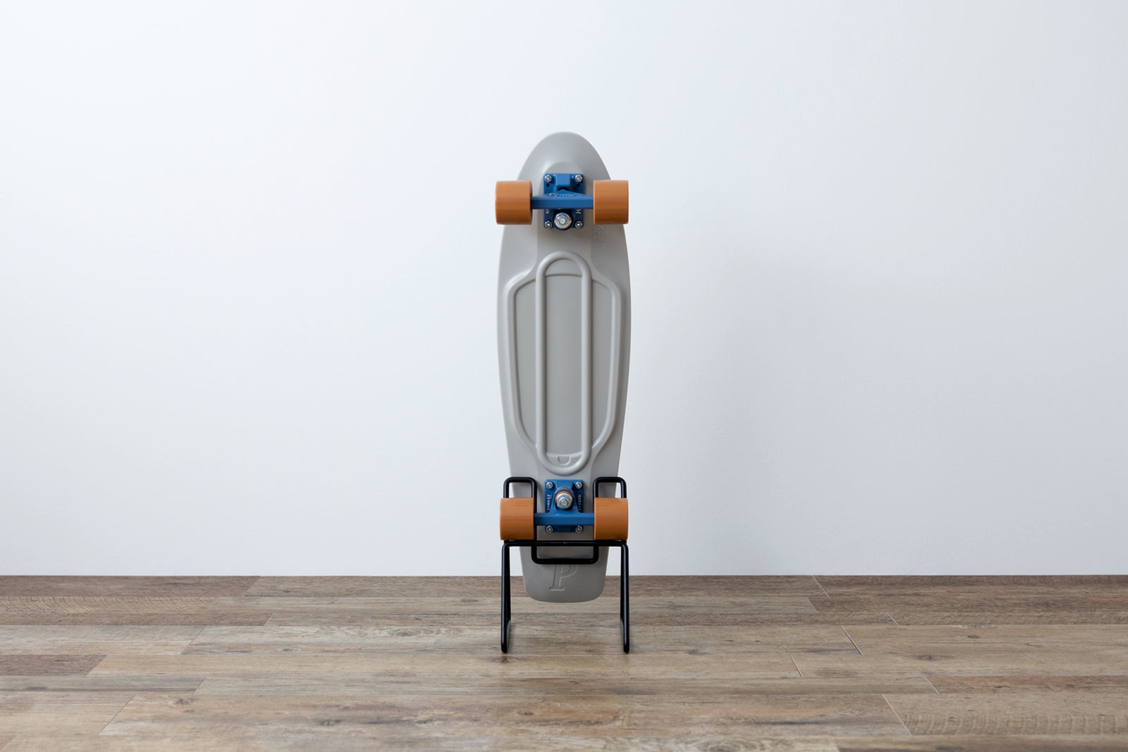 小型のスケートボード用の鉄製床置きストレージです。テールと後輪をマウントして立たせています。表面は粉体塗装を施してあります。組み立ては不要で、箱から取り出して設置するだけでご使用いただけます。ペニー27インチに合わせて設計されていて、22インチにも対応しています。