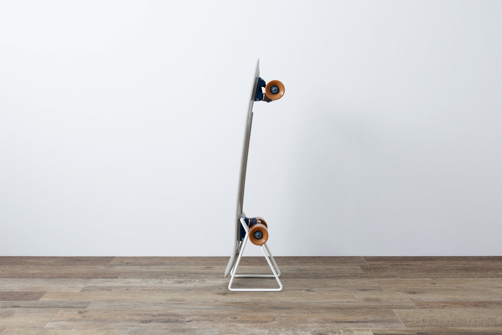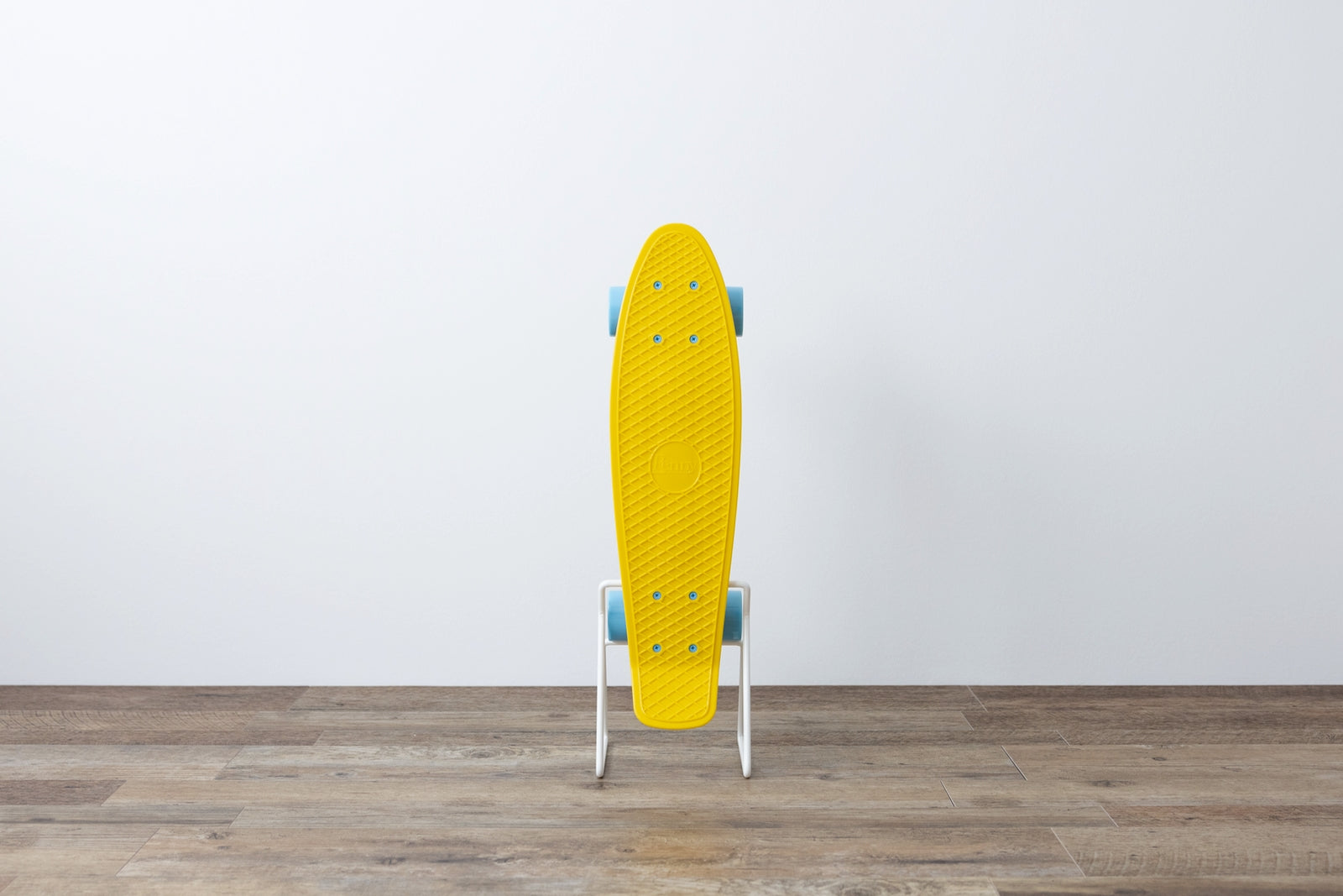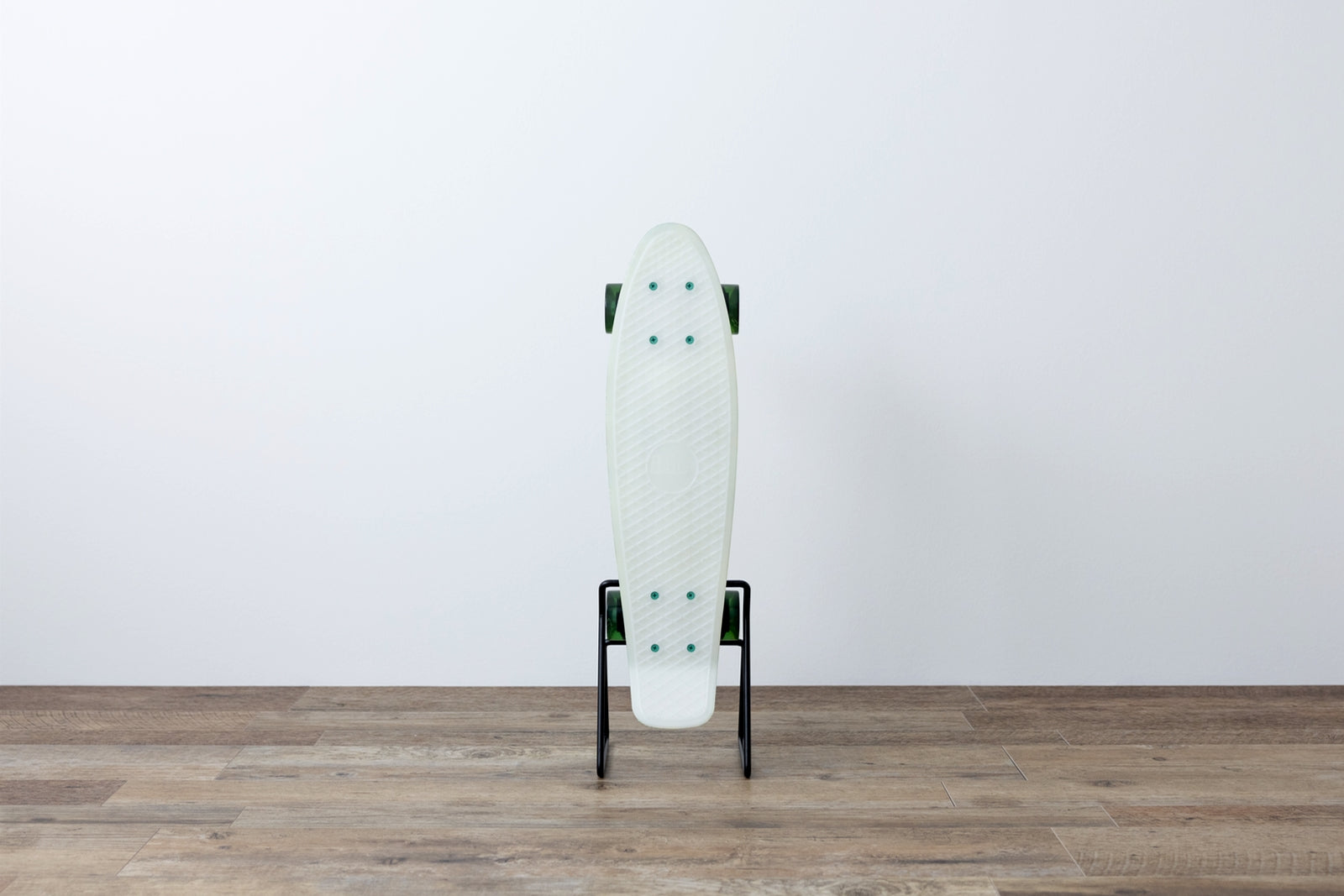 小型のスケートボード用の鉄製床置きストレージです。テールと後輪をマウントして立たせています。表面は粉体塗装を施してあります。組み立ては不要で、箱から取り出して設置するだけでご使用いただけます。ペニー27インチに合わせて設計されていて、22インチにも対応しています。