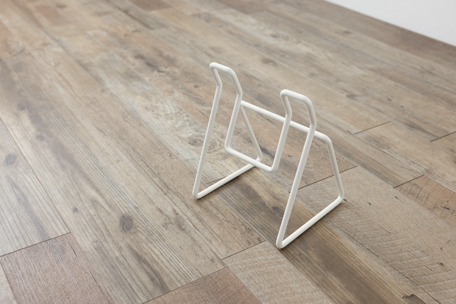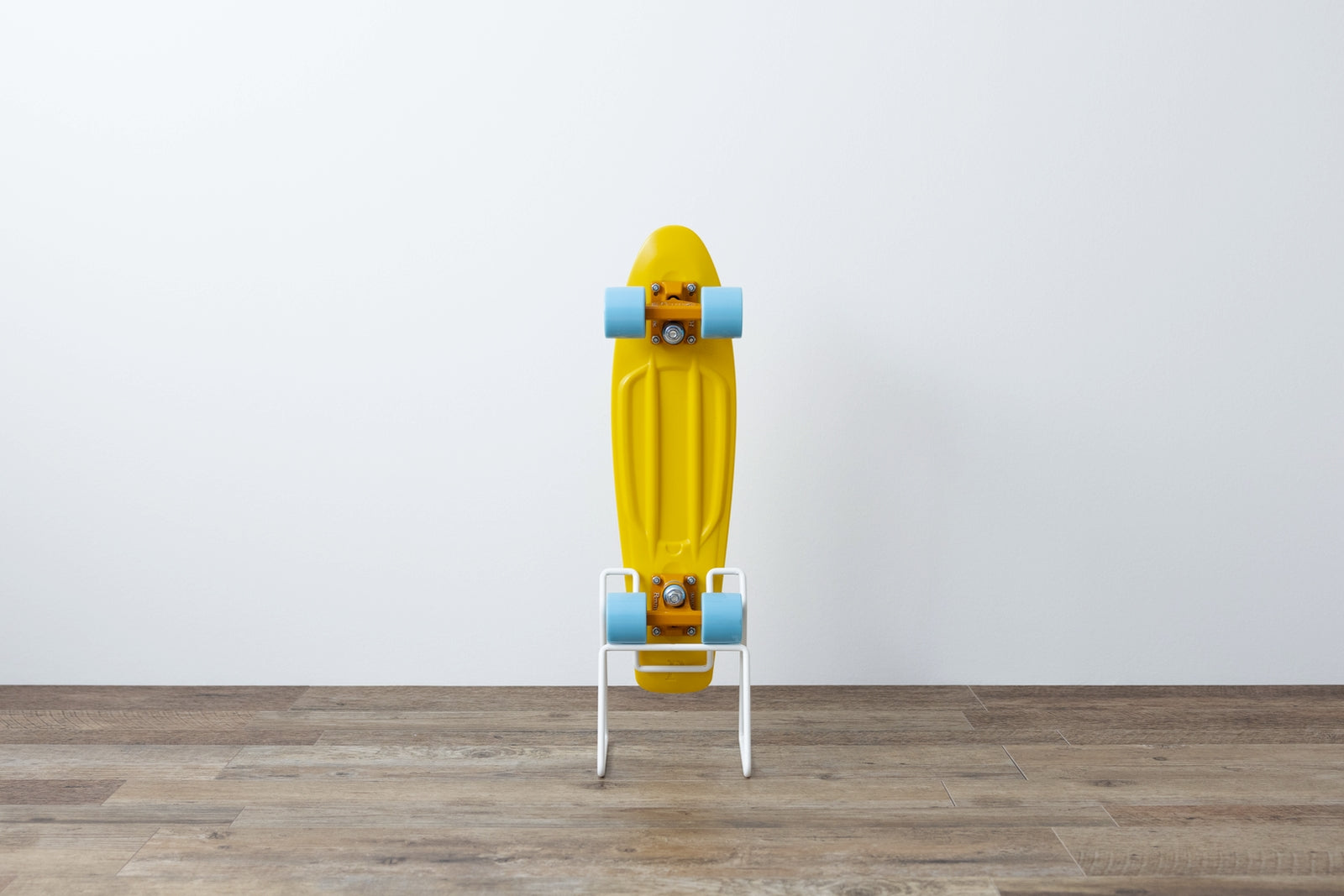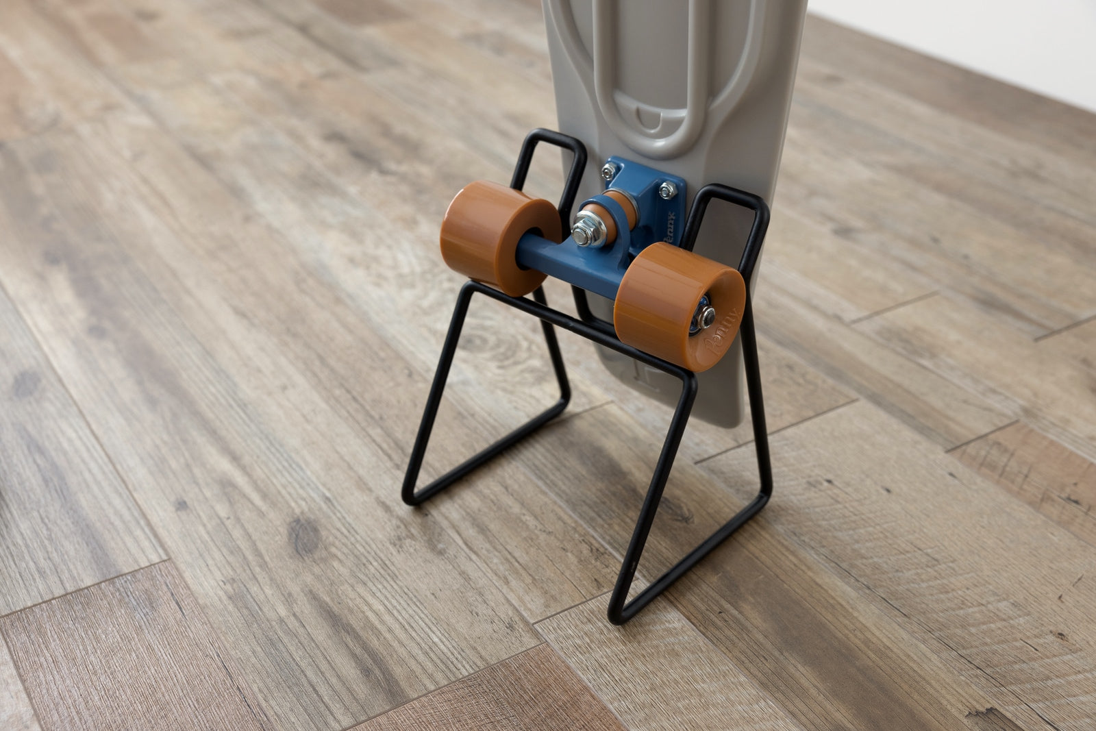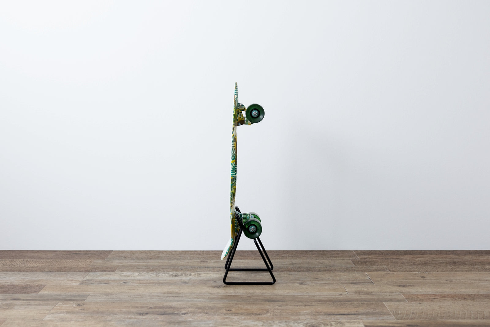 小型のスケートボード用の鉄製床置きストレージです。テールと後輪をマウントして立たせています。表面は粉体塗装を施してあります。組み立ては不要で、箱から取り出して設置するだけでご使用いただけます。ペニー27インチに合わせて設計されていて、22インチにも対応しています。