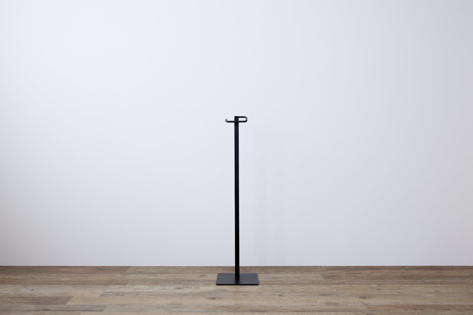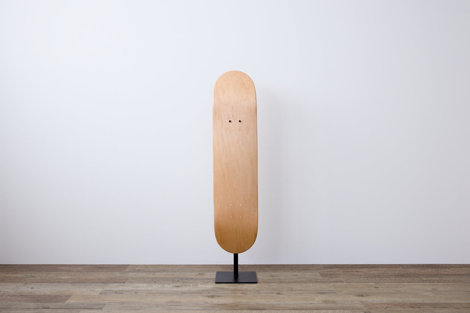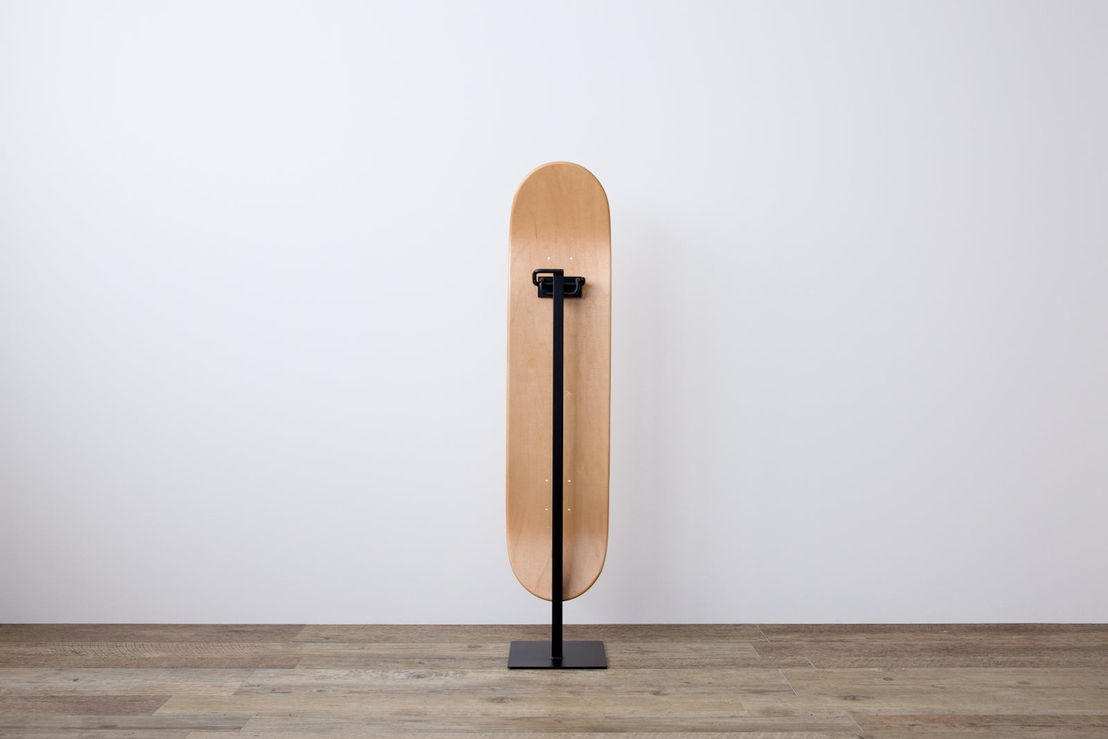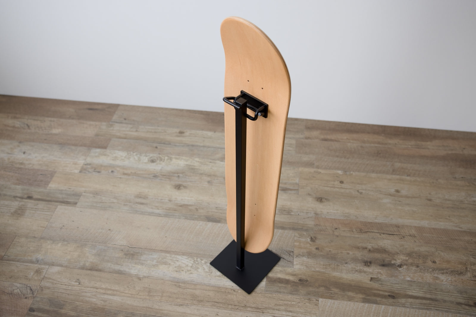 トラックが付いていないスケートボードを飾るための鉄製床置きストレージです。支柱に取り付けられたハンガーへスケートボードに取り付けられたブラケット(別売り)を引っ掛けてマウントします。本製品は高さ調整ができない固定式となります。
