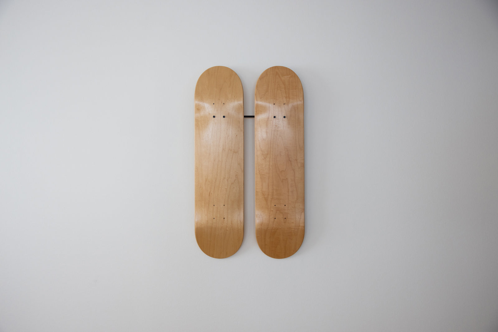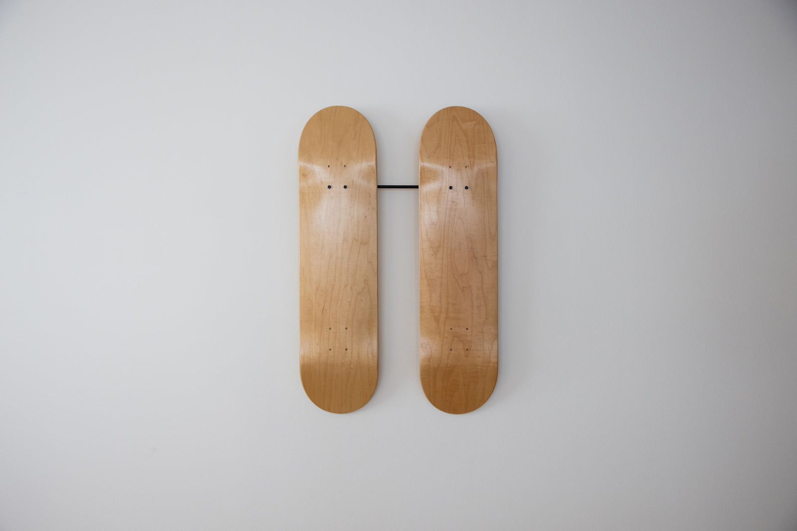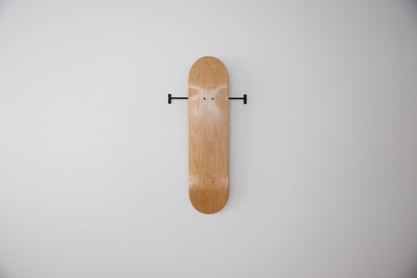 スケートボードを壁面にディスプレイするための金具類です。スケートボードに吊金具を取り付け、壁に設置したバーに掛けるだけなので、配置替えも容易にできます。板の枚数や配置に応じて、バーや数を変えてご使用ください。
